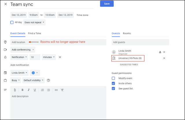 Change to locations of booked rooms in Google Calendar Google